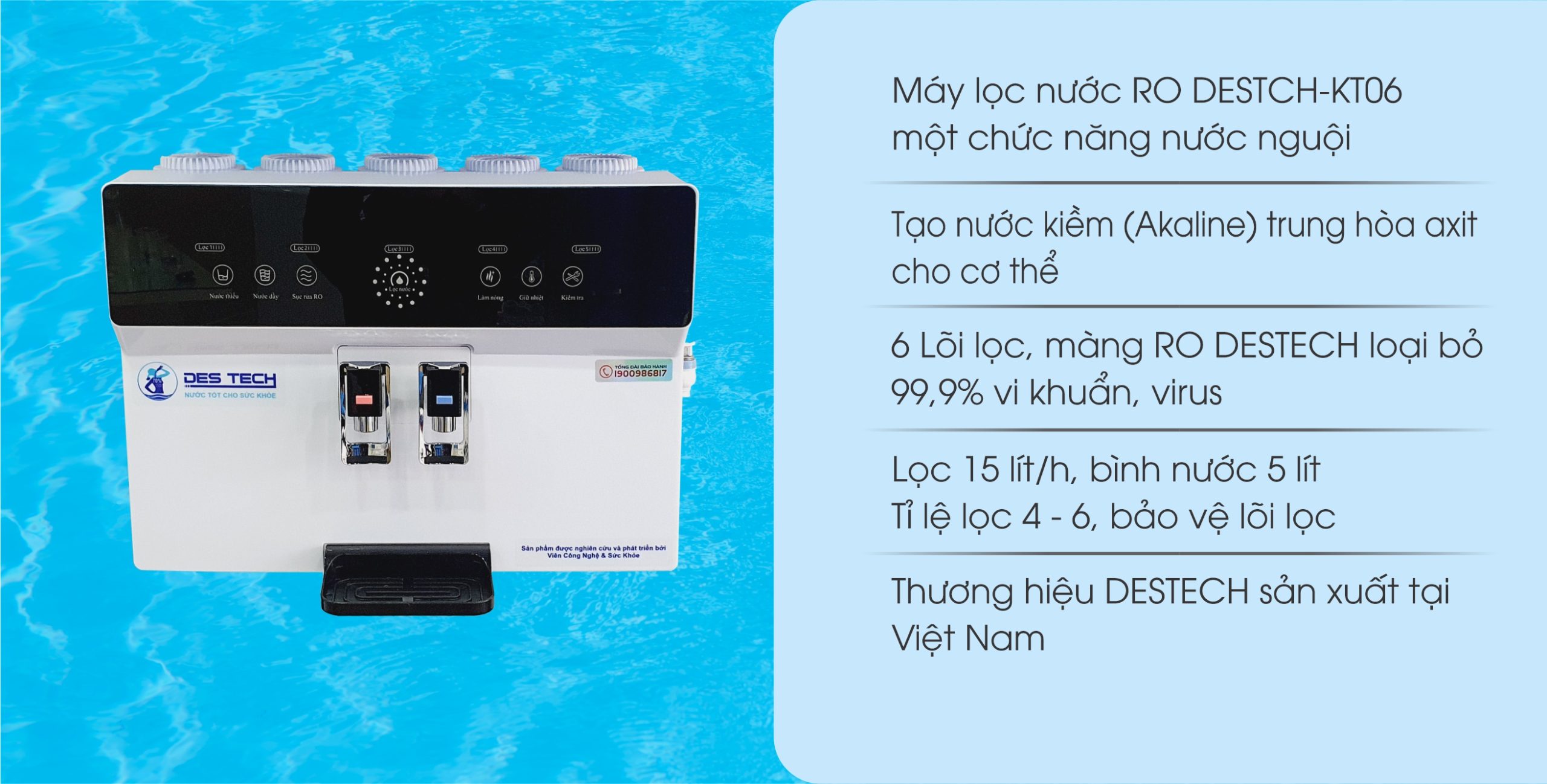 Máy lọc nước Nano nóng lạnh DESTECH-KT06 lõi là lựa chọn an toàn về chất lượng, tiện lợi trong sử dụng, đáp ứng tốt nhu cầu nước uống hàng ngày