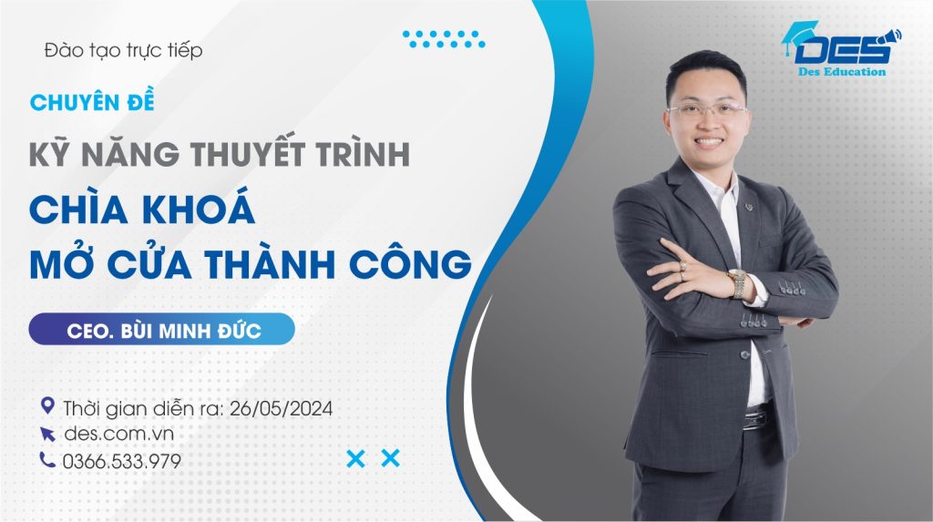 Không phải ai sinh ra cũng có năng khiếu thuyết trình. Đối với nhiều người, việc đứng lên trước tập thể và trình bày một vấn đề là một thách thức lớn. Tuy nhiên, điều này không có nghĩa là bạn không thể trở thành một người thuyết trình giỏi. Chương trình đào tạo thuyết trình của DES EDU – Cộng đồng đại sứ lan toả nước tốt sẽ trang bị cho bạn sự tự tin để luôn nắm thế kiểm soát trong bất kỳ tình huống phát sinh nào, dù con mắt của cả đám đông đang đổ dồn về phía bạn. Qua khoá học, bạn sẽ tích lũy được các kiến thức và kỹ năng cần thiết để thoát khỏi lo lắng, tự tin trình bày ý tưởng của mình một cách sinh động và lôi cuốn nhất.