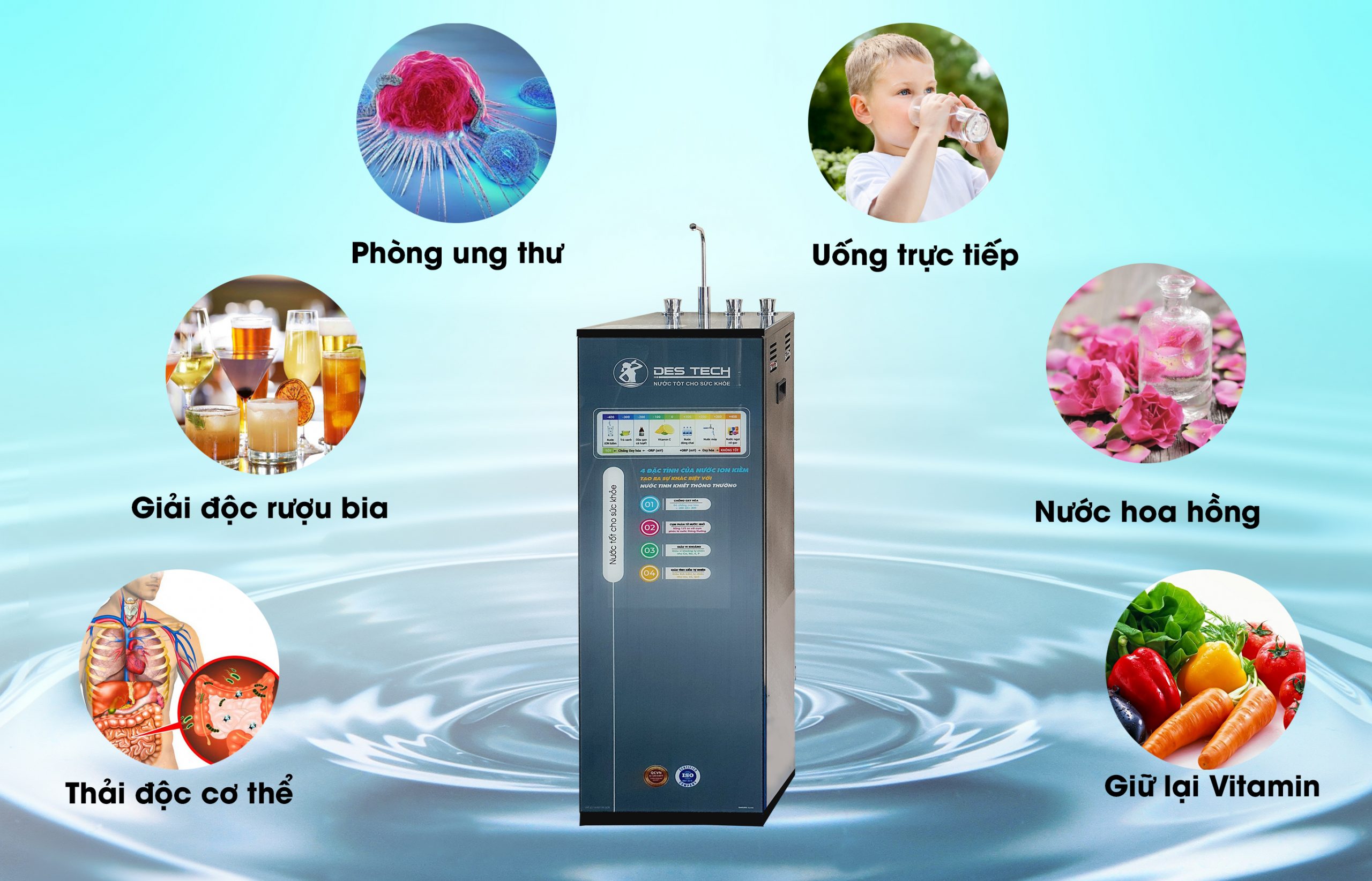 Nước chảy qua máy lọc nước tạo kiềm DES TECH đã được lọc sạch mọi yếu tố có hại, vi rút,… chất có hại cho sức khỏe và bổ sung các khoáng chất có lợi. Sử dụng trực tiếp nguồn nước được lọc qua máy lọc nước tạo kiềm DES TECH là cách tốt nhất để đảm bảo được sức khỏe và giảm thiểu rủi ro bệnh tật.